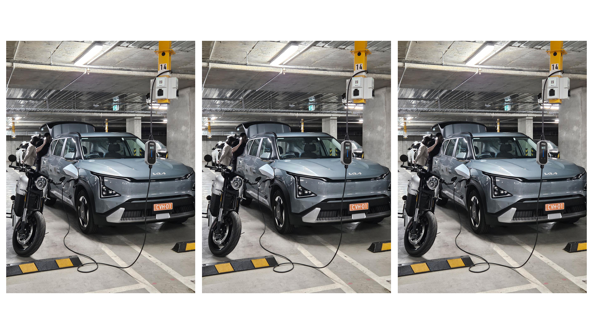 They are essentially ordinary power outlets — “Level 1” charging points — mounted on bollards suspended from the ceiling of the car park. They are managed by software that limits how many vehicles can charge at once, rotating charging access between different zones in roughly 10-minute intervals when demand is high.