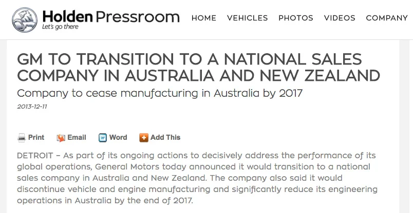 But GM could not even announce the decision to shut Holden down with integrity. Holden’s official factory closure announcement was titled “GM to Transition to a National Sales Company in Australia and New Zealand”. Such evasive bullshitters. That announcement is accessible online today - loaded with indefensible weasel words. It’s an advertisement for how not to communicate with authenticity and integrity.